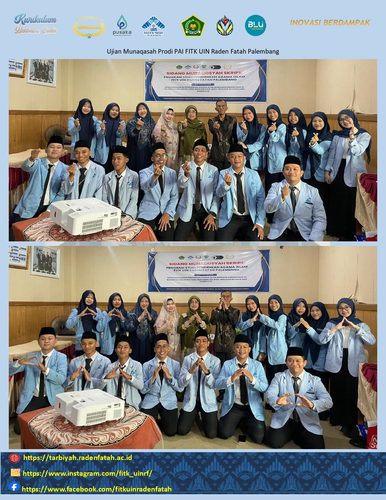 Kaprodi mengucapkan selamat untuk mahasiswa yang dinyatakan lulus ujian skripsi, "Semoga lulusa PAI FITK menjadi suri tauladan yang baik, berkontribusi banyak terhadap masyarakat demi membanggakan almamater."